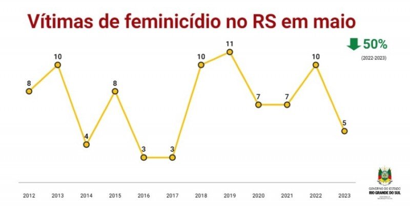 Em maio, mês que marca o Dia das Mães, os indicadores criminais da SSP voltaram a trazer um alento para a sociedade gaúcha, com a queda de 50% dos casos de feminicídio no Estado. No último mês, foram cinco, contra 10 em maio de 2022. Das cinco vítimas, apenas uma contava com medida protetiva. Já no acumulado, de janeiro a maio, a queda é de 29%, ante mesmo período do ano passado. Neste período, ocorreram 34 feminicídios contra 48 casos.