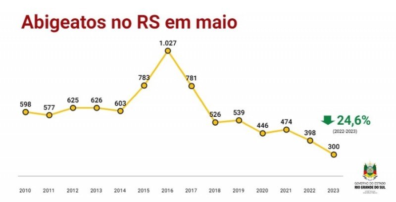 No mês passado, também houve uma redução dos crimes de abigeato no RS. No meio rural, foram computados 300 casos, contra 398 em igual período de 2022, resultando em uma queda de 24,6%.