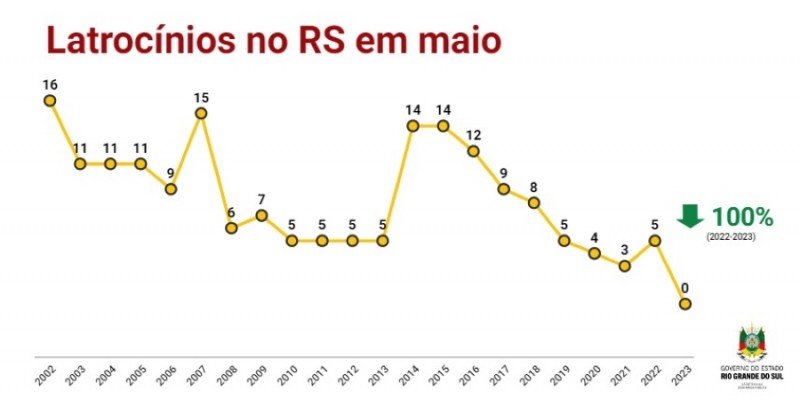 Com relação aos latrocínios, o Rio Grande do Sul fechou o mês de maio, sem nenhum caso computado, totalizando uma redução de 100%. Em maio de 2022, foram cinco latrocínios. Já no acumulado do ano, a diminuição chega a 36%.