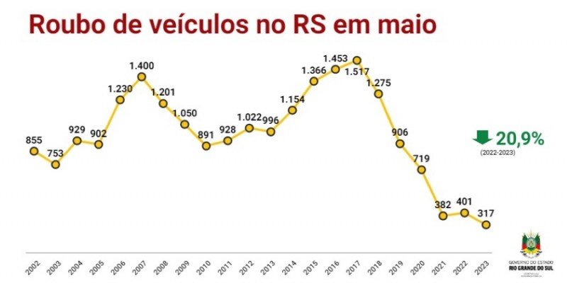 Acompanhando a tendência de queda dos índices de criminalidade, maio também foi marcado pela redução histórica de roubos de veículos no RS, chegando a 21%. Ao todo, foram registradas 317 ocorrências contra 401 em maio de 2022. No acumulado, somando os primeiros cinco meses do ano de 2023, a queda é de 9,7% em relação ao mesmo período do ano passado. Em Porto Alegre, a diminuição foi de 12% no mês passado.