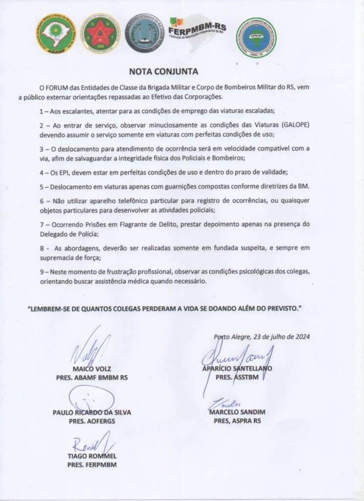 Associações ligadas aos militares estaduais emitiram nota nesta terça-feira orientando a atuação dos policiais e bombeiros, que muitas vezes em condições inadequadas não medem esforços para prestar o serviço de segurança pública no Rio Grande do Sul.