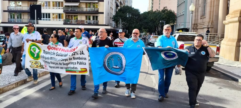 Entidades representativas dos servidores da segurança pública se somaram ao movimento que se concentrou em frente ao prédio do Instituto de Previdência do Estado (IPERGS) e percorreu as ruas da capital, chegando ao Palácio Piratini onde as lideranças se manifestaram com palavras de ordem.