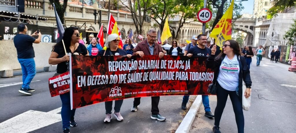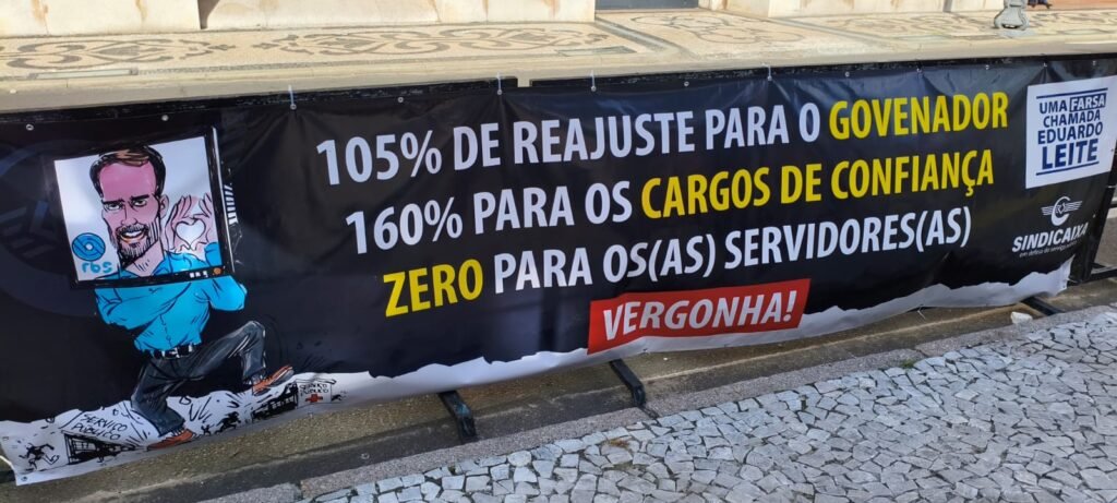 Na manhã desta sexta-feira, 16/05, os servidores públicos do estado do Rio Grande do Sul realizaram ato reivindicatório em frente ao Palácio Piratini, cobrando do governo Eduardo Leite soluções com relação ao IPE-Saúde e reposição salarial de no mínimo 12,14%.