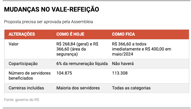 A proposta de aumento no vale-refeição dos servidores estaduais anunciada nesta terça-feira (3) pelo governador Eduardo Leite também muda algumas regras do benefício. Além do acréscimo no valor mensal, o governo decidiu acabar com a coparticipação dos funcionários e autorizar o pagamento a um número maior de categorias.