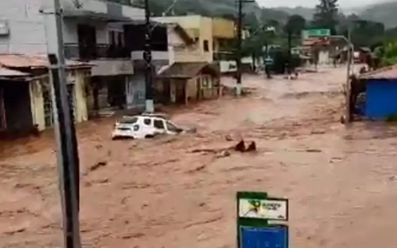 Nas imagens que circulam pelas redes sociais, moradores assistem incrédulos aos estragos da enchente. Além da forte correnteza, casas e lojas aparecem alagadas no vídeo.