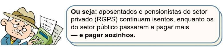 Um dos pontos mais polêmicos está no artigo 149 da Emenda, que permitiu cobrar contribuição previdenciária de aposentados e pensionistas do setor público mesmo sobre valores que ultrapassem apenas o salário mínimo. Antes da reforma, essa cobrança só existia sobre valores que ultrapassassem o teto do RGPS / INSS (hoje em R$ 8.157,41). A regra nova, no entanto, autorizou que a contribuição fosse feita a partir de qualquer valor acima do salário mínimo — e exclusivamente para quem é do Regime Próprio de Previdência Social (RPPS).
