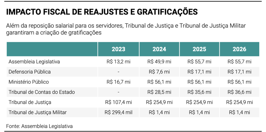 O impacto estimado aos cofres públicos até o final do ano de 2026 é de R$ 1,3 bilhão. Entram no cálculo as gratificações criadas para servidores do Tribunal de Justiça e do Tribunal de Justiça Militar nos mesmos projetos de reposição salarial.