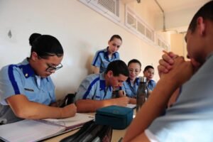 :: Neste ano, o Colégio Tiradentes conta com 141 alunos. São três turmas de primeiro ano e duas turmas para os 54 alunos do 2º ano. Os adolescentes têm, em média, entre 14 e 16 anos. Cinco alunos frequentaram uma escola normal no 1º ano do Ensino Médio em 2022 mas, para poder ter acesso à escola da BM, fizeram o concurso e repetem o 1º ano em 2023. Para serem aprovados, assim como nas escolas estaduais de ensino comum, os alunos devem atingir média intelectual 7.