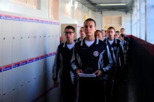 A chegada dos alunos ocorre às 7h. Na entrada, os estudantes são recebidos pelos administradores do colégio, fazem um cumprimento de “bom dia”, que é similar à continência. Os celulares são colocados em uma caixa, que fica na administração, e os alunos não têm acesso aos aparelhos ao longo dos estudos.