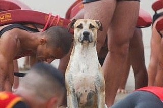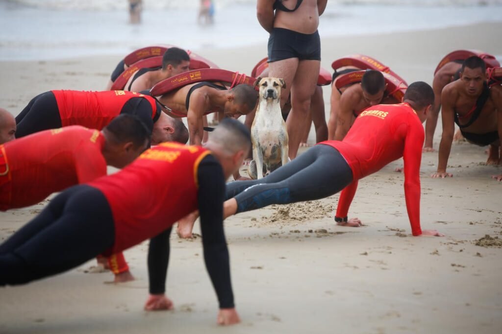 Imagem foi captada durante um treinamento à beira-mar, com a presença de um cachorro que parecia fiscalizar o trabalho do grupo