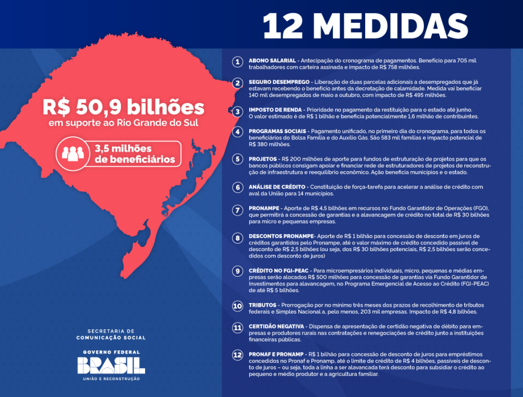 Governo Federal anunciou um pacote de R$ 50,9 bilhões para auxiliar famílias, trabalhadores rurais, empresas e municípios no Rio Grande do Sul. As 12 medidas de apoio aos gaúchos constam de Medida Provisória encaminhada ao Congresso Nacional pelo presidente da República, Luiz Inácio Lula da Silva, nesta quinta-feira, 9 de maio.