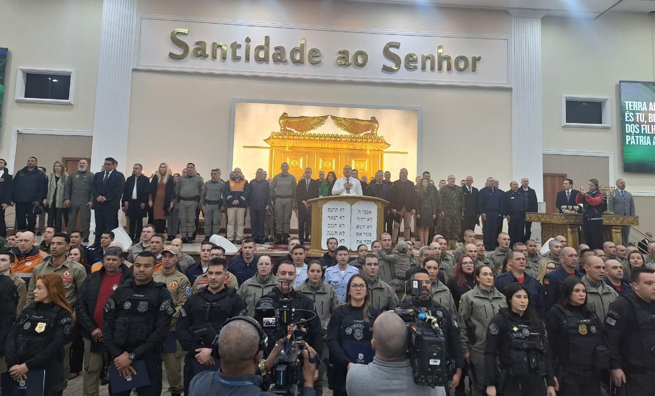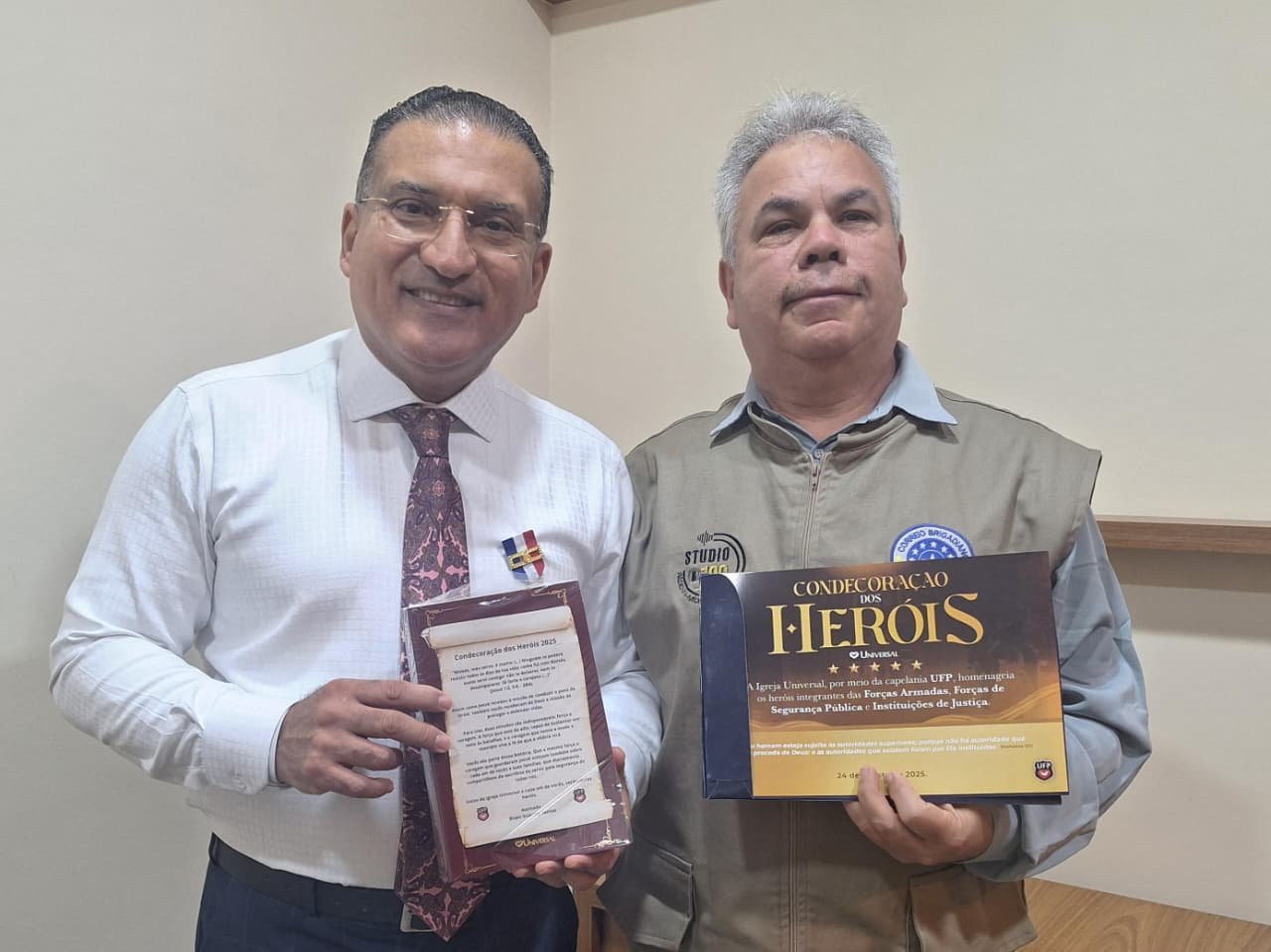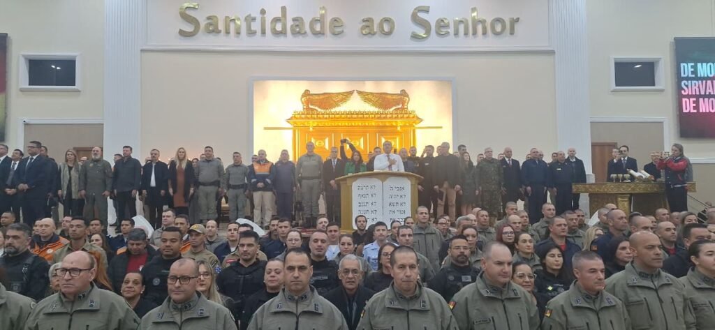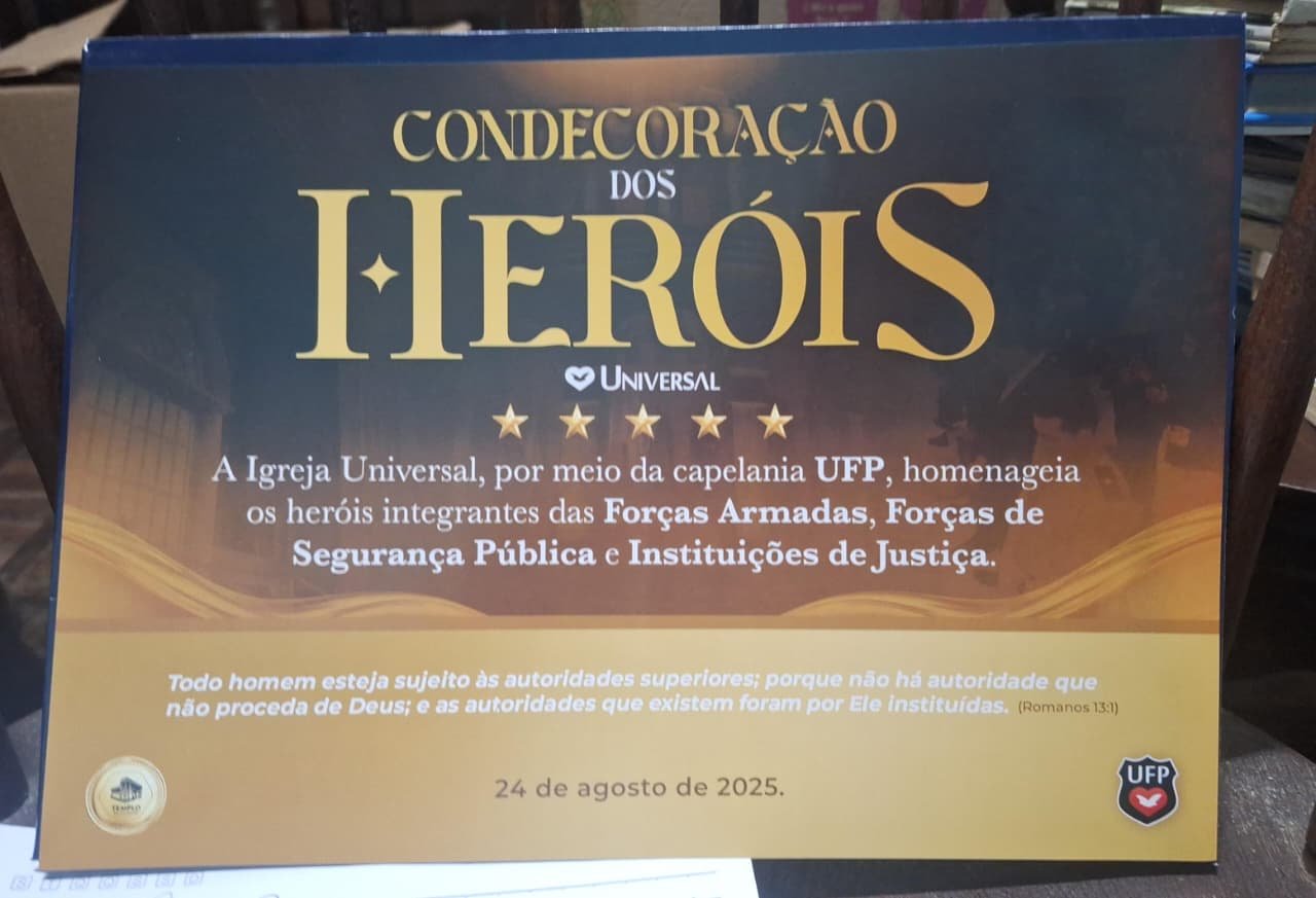 Na manhã deste domingo, 24 Agosto 2025, durante culto dirigido pelo bispo Guaracy Santos, a Igreja Universal do Reino de Deu – IURD, matriz, Porto Alegre, concedeu condecoração dos Heróis integrantes das Forças de Defesa, Segurança e Justiça, homens e mulheres que ombreiam a vocação, a coragem e o destemor no desempenho abnegado de suas funções relevantes à Sociedade. O Evento, que também ocorreu em outras cidades, contou com a presença de várias Autoridades, ocasião em que o Comandante-Geral da Brigada Militar, Coronel Cláudio Feoli, acompanhado dos coronéis Douglas e Luigi, homenagearam o Bispo Guaracy com medalha da BM por seu apoio, parceria, reconhecimento, além do trabalho que a IURD desenvolve nas comunidades carentes.