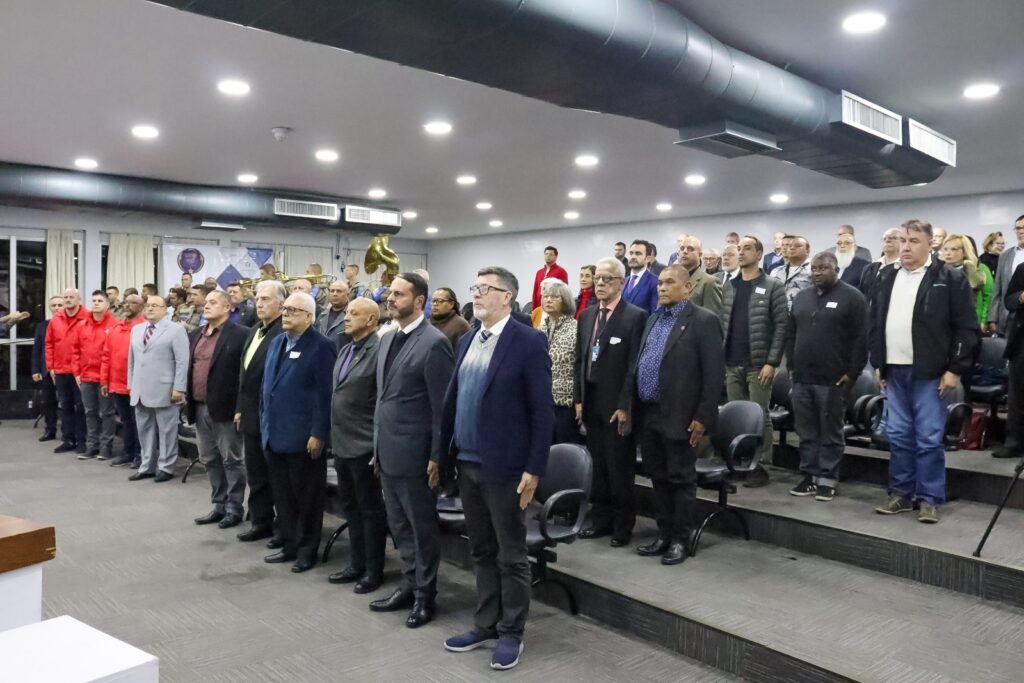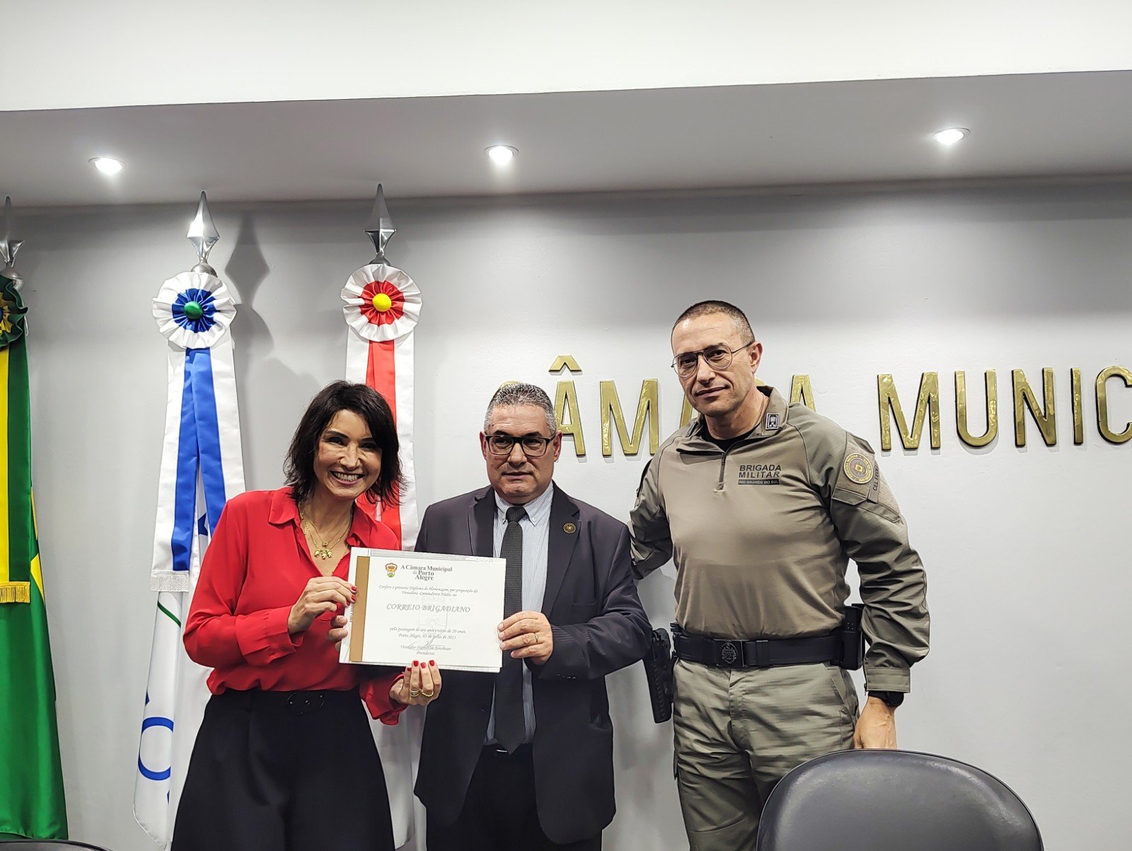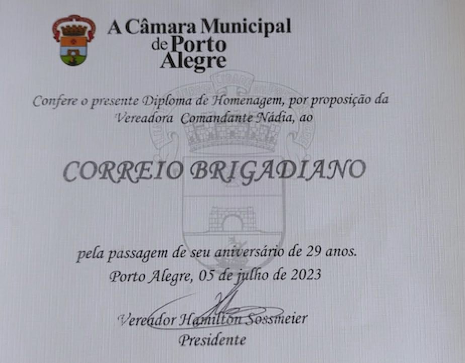 A vereadora Comandante Nádia, anfitriã da casa que recebeu a cerimônia, após sua fala destacando a importância do Jornal, passou a mão do Diretor Gilson um Diploma da Câmara Municipal de Porto Alegre, assinado pelo presidente, Vereador Hamilton Sossmeier. e em concordância com todos os demais vereadores.