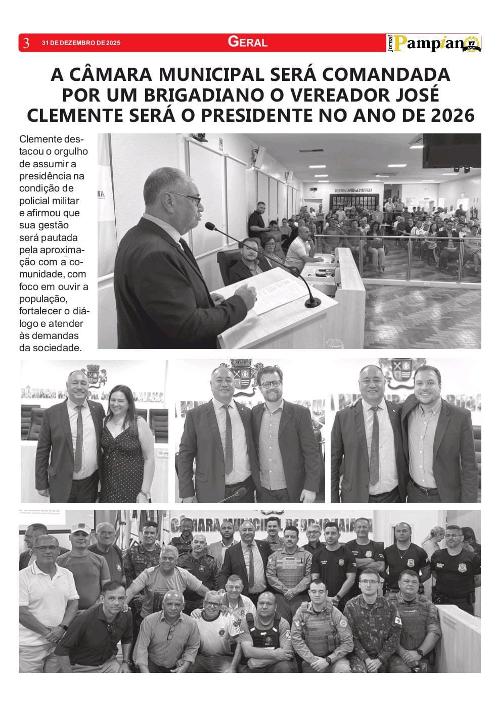 Parabenizamos o Brigadiano José Clemente pela assunção ao cargo de Presidente da Câmara de Vereadores de Uruguaiana. Sua eleição representa um marco importante para a representatividade policial no Legislativo Municipal, levando ao parlamento a experiência de quem conhece a realidade da segurança pública e as demandas da comunidade. Desejamos uma gestão pautada pelo diálogo, pela responsabilidade e pelo compromisso com o interesse coletivo.