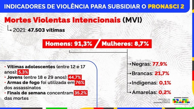 De acordo com dados do Fórum Brasileiro de Segurança Pública, em 2021, o país registrou 47.503 vítimas de mortes violentas intencionais – categoria que agrega vítimas de ocorrências de homicídio doloso, latrocínio, lesão corporal seguida de morte, feminicídio, mortes decorrentes de intervenção policial e vitimização policial. O levantamento exclusivo do Fórum foi feito especialmente para o Pronasci para mapear os territórios mais vulneráveis e direcionar as ações.