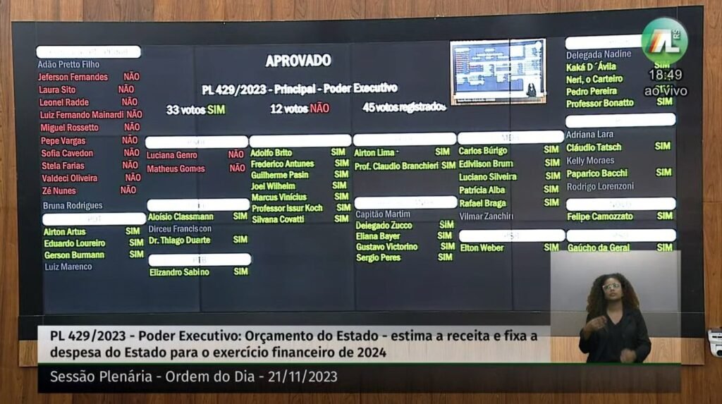 Com debates relacionados ao projeto de aumento de ICMS e dos efeitos climáticos no Rio Grande do Sul, a Assembleia Legislativa aprovou o Orçamento para 2024 ontem por 33 votos favoráveis e 12 contrários. A peça do Executivo prevê déficit de R$ 2,7 bilhões e foi contestada pelos partidos de esquerda da oposição, que alega descumprimento das previsões constitucionais em áreas da saúde, educação, ensino superior e ciência e tecnologia.