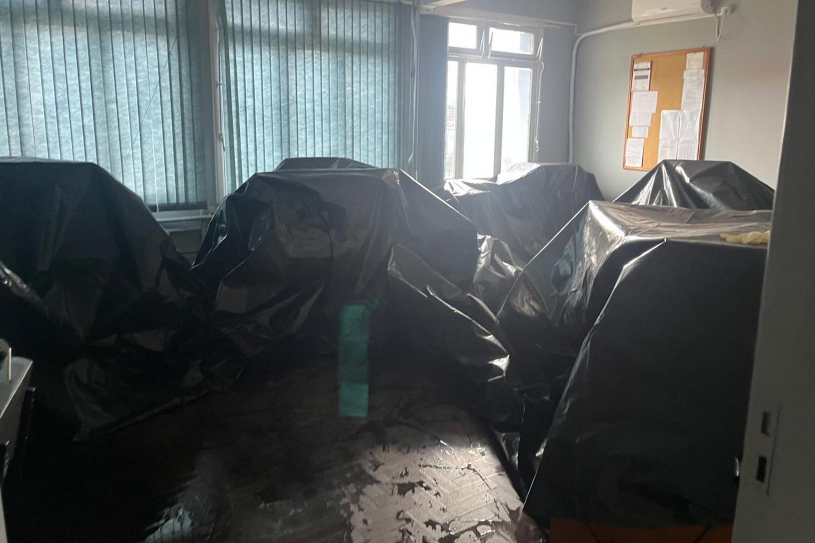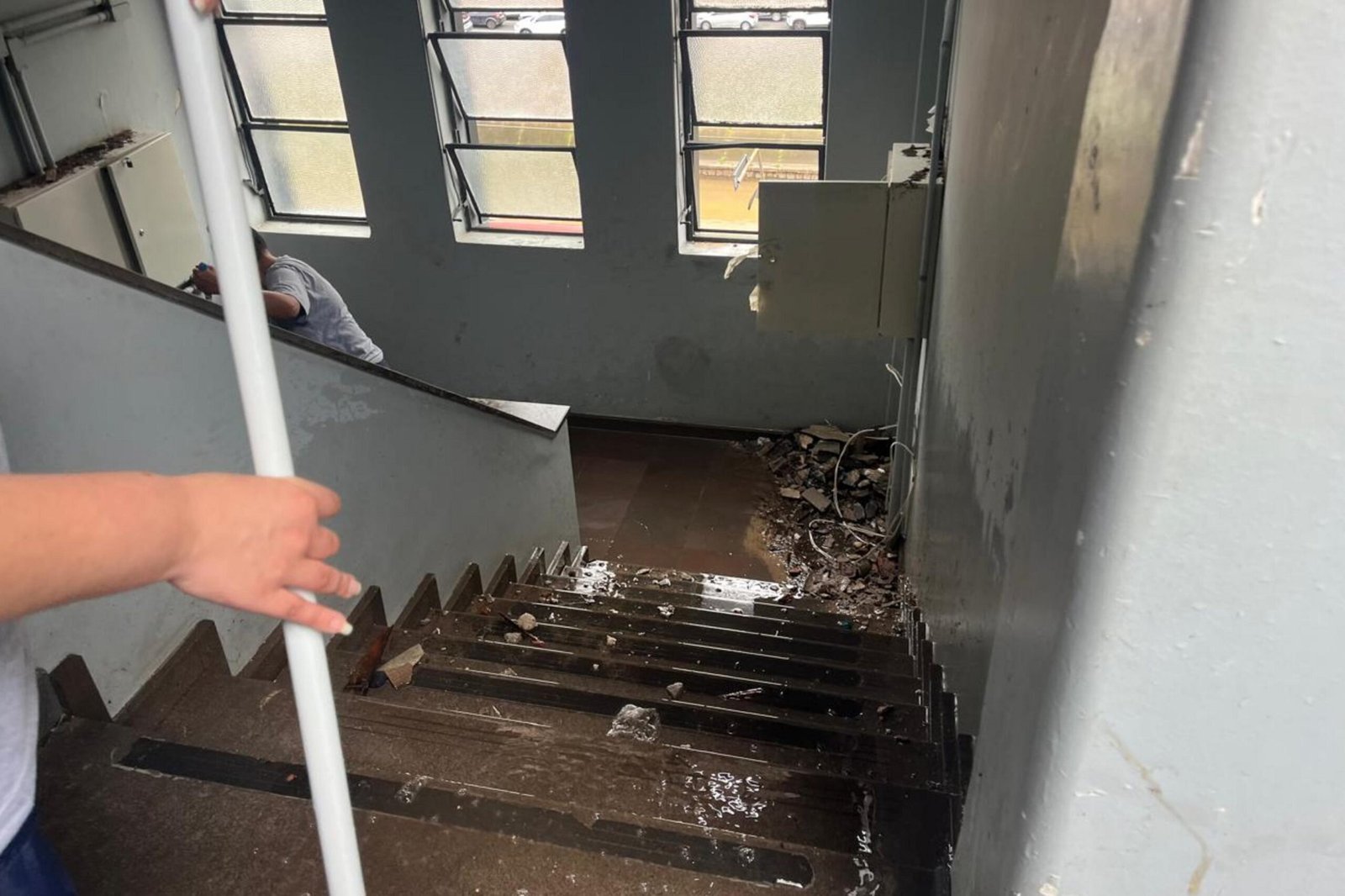 Último andar do prédio está a céu aberto; água deixou fora do ar sistema de monitoramento de chamadas grampeadas