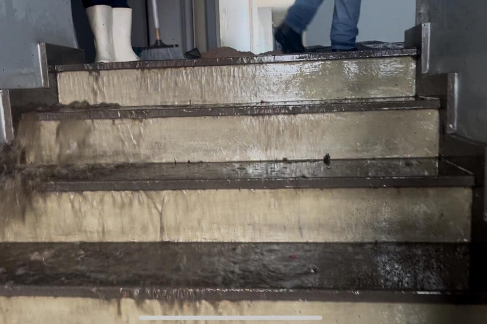 Para alguns funcionários do Palácio da Polícia de Porto Alegre, a manhã desta segunda-feira (22) foi dedicada à limpeza da água que alagava o prédio. Desde o terceiro andar, servidores empurravam o resto de chuva da última madrugada escada abaixo com rodos e vassouras.