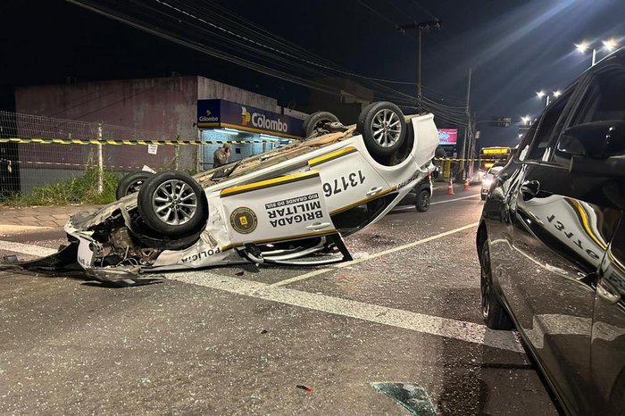 Viatura da Brigada Militar capota durante perseguição a carro furtado em Porto Alegre