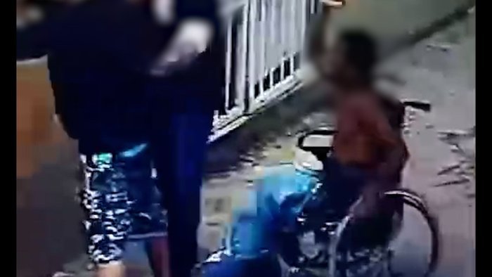 Imagens que circulam nas redes sociais mostram que o agente, à paisana, está revistando um suspeito quando um homem em uma cadeira de rodas se aproxima e o esfaqueia.
