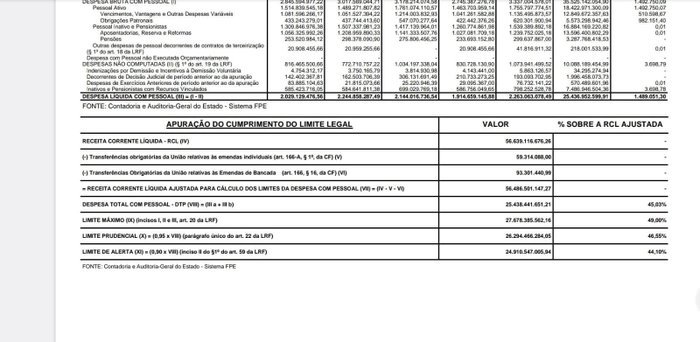 A despesa total com pessoal, segundo o resumo publicado no Diário Oficial do Estado, foi de R$ 25,4 bilhões, o que equivale a 45,03% da receita corrente líquida, que chegou a R$ 56,5 bilhões. O limite prudencial é de 46,55% e o limite máximo, de 49%.