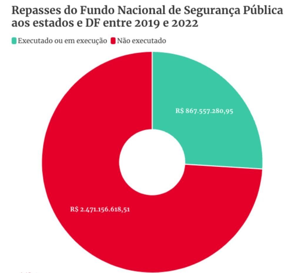 Os estados brasileiros e o Distrito Federal deixaram de destinar R$ 2,47 bilhões da verba disponibilizada pela União para segurança pública. O Fundo Nacional de Segurança Pública (FNSP) repassou esse valor durante a gestão do presidente Jair Bolsonaro (PL), de 2019 a 2022.
