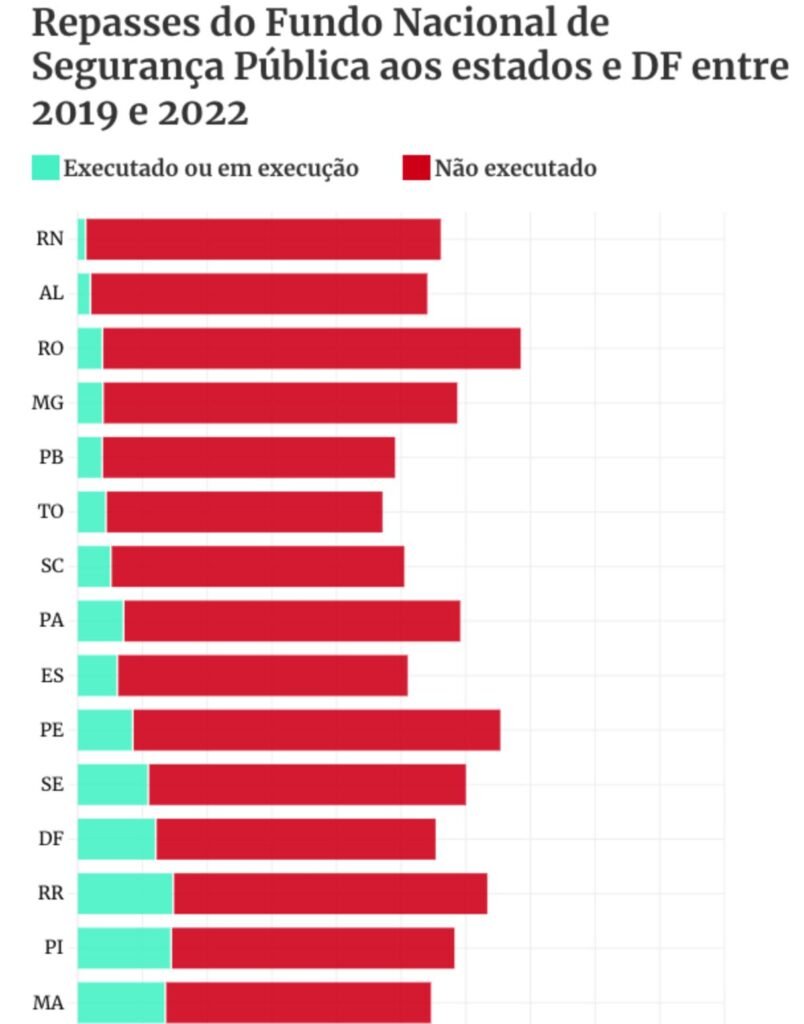 O Rio Grande do Norte é o estado com a menor execução (2,2%), segundo dados do MJSP. Além da burocracia, a pandemia da Covid-19 foi elencada como um fator que atrapalhou o uso da verba.