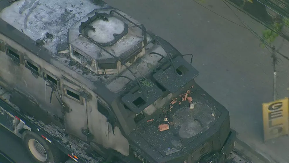 Traficantes destruíram um veículo blindado da Polícia Militar na comunidade do Bateau Mouche, na Praça Seca, na Zona Oeste do Rio de Janeiro, na noite desta terça-feira (6). Os criminosos lançaram granadas e coquetéis-molotovs, detonados sob o Caveirão. O fogo atingiu a parte da mangueira de combustível e se alastrou rapidamente pelo veículo.