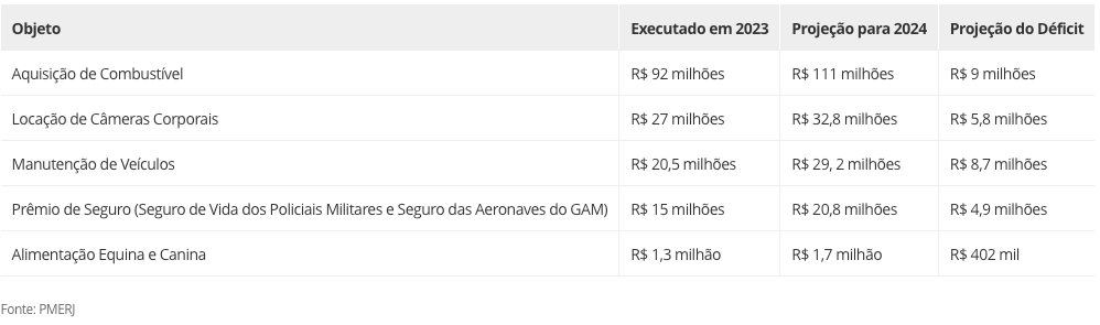 Outro grupo de despesas fixas da Polícia Militar em que há previsão de impacto com os cortes determinados pelo governo é o de contratos de serviços continuados. Entre eles estão os de aquisição de combustível, manutenção de viaturas, seguros de vida para os policiais e até da alimentação dos cães e cavalos da corporação. De acordo com o relatório financeiro, a PM calcula que com contratos vai gastar R$ 318 milhões em 2024, mas só foram disponibilizados pelo governo R$ 213 milhões. O governo reafirmou que o contingenciamento “não significa que não haverá recursos para custear as despesas”