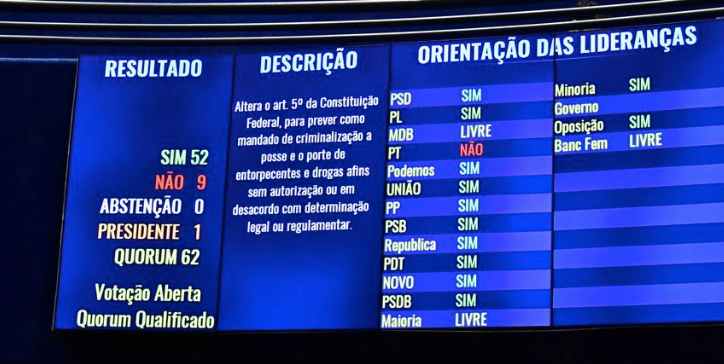O Plenário do Senado aprovou nesta terça-feira, 16, a PEC sobre drogas (PEC 45/2023). Foram 53 votos a favor e 9 contrários na votação em primeiro turno. Em seguida, houve acordo para votação em segundo turno sem a discussão em mais três sessões deliberativas. O placar em segundo turno ficou em 52 a 9. A proposta de emenda à Constituição segue para a Câmara dos Deputados.