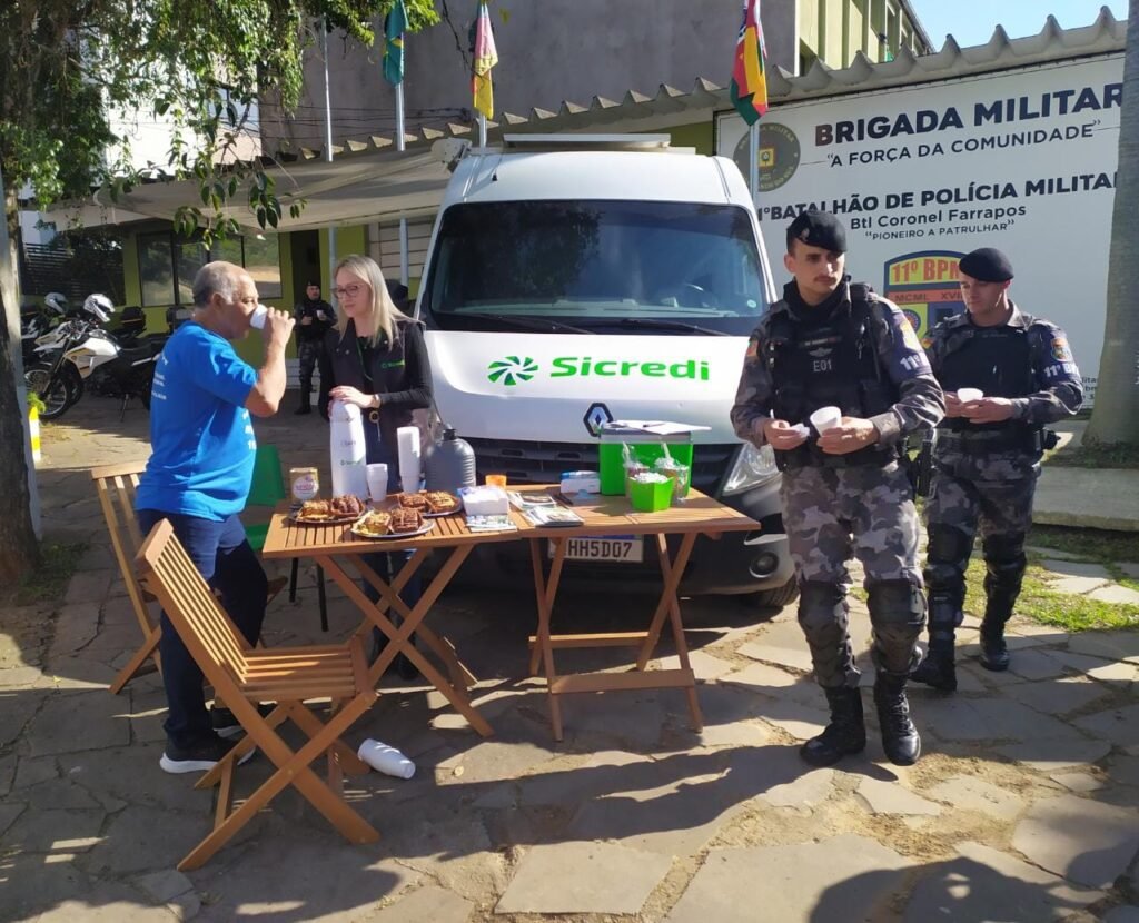 Coronel Jarbas Vanin, juntamente com duas servidoras, ofertavam alguns dos tantos serviços da Cooperativa aos participantes do evento, além de um gostoso cafezinho acompanhado de bolo de cenoura. Aos interessados que foram se cadastrando foi disponibilizado um número para concorrer a duas belas cuias para sorver aquele chimarrão brigadiano bem buenacho!