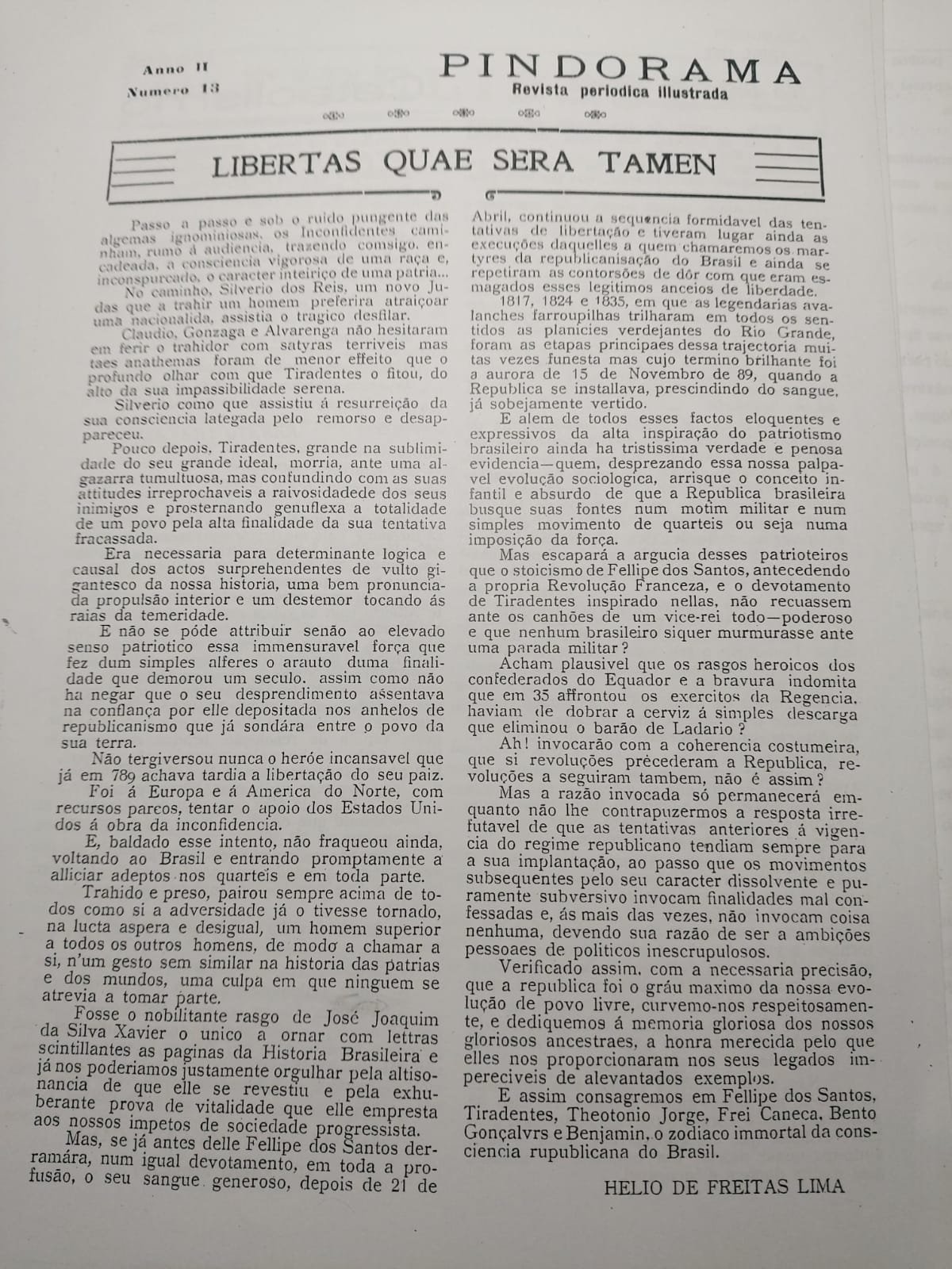 “Considerando que entre os grandes da história pátria que se empenharam pela manutenção da ordem interna, a vulta a figura heróica de Alferes Joaquim José da Silva Xavier (Tiradentes) o qual, anteriormente aos acontecimentos que foram base de nossa Independência, prestara à segurança pública, quer na esfera militar quer na vida civil, patrióticos serviços assinalados em documentos do tempo e de indubitável autenticidade;
