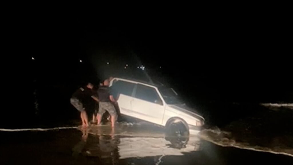 O carro, um Fiat Uno, foi arrastado pelas ondas enquanto a maré subia. Imagens registradas o local mostram a dificuldade dos policiais em retirar o veículo da água. Pelo menos cinco pessoas participaram da ação que durou em torno de 15 minutos.